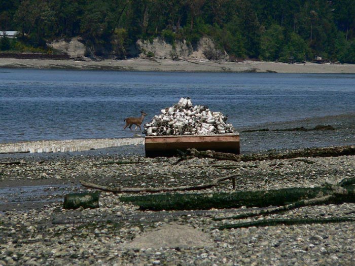 The geoduck operator anchored a barge on the beach during May 2006. It was piled with PVC pipe for the new farm. Just to the left of the barge you can see a deer in the water.
